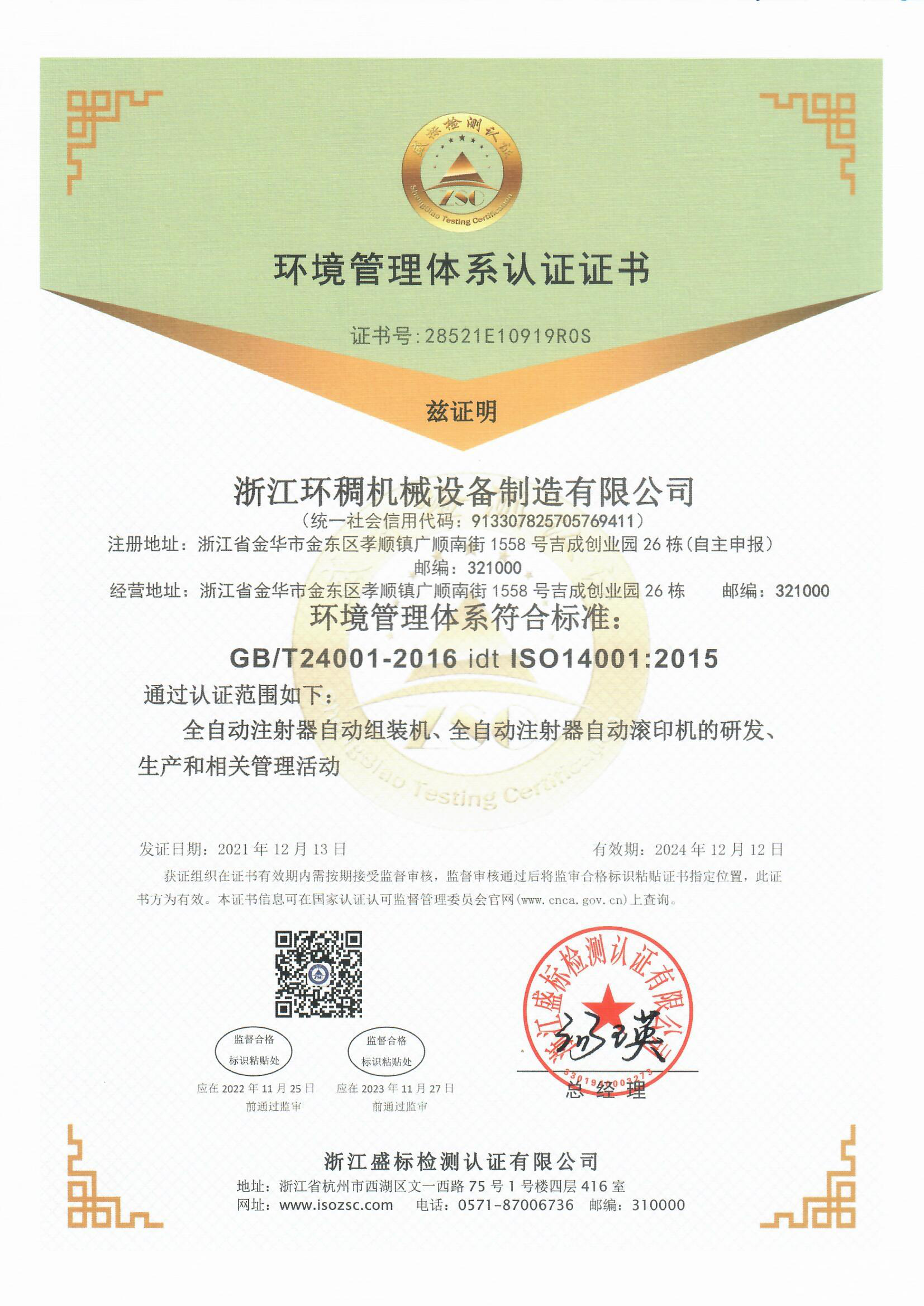 環境管理體系認證證書