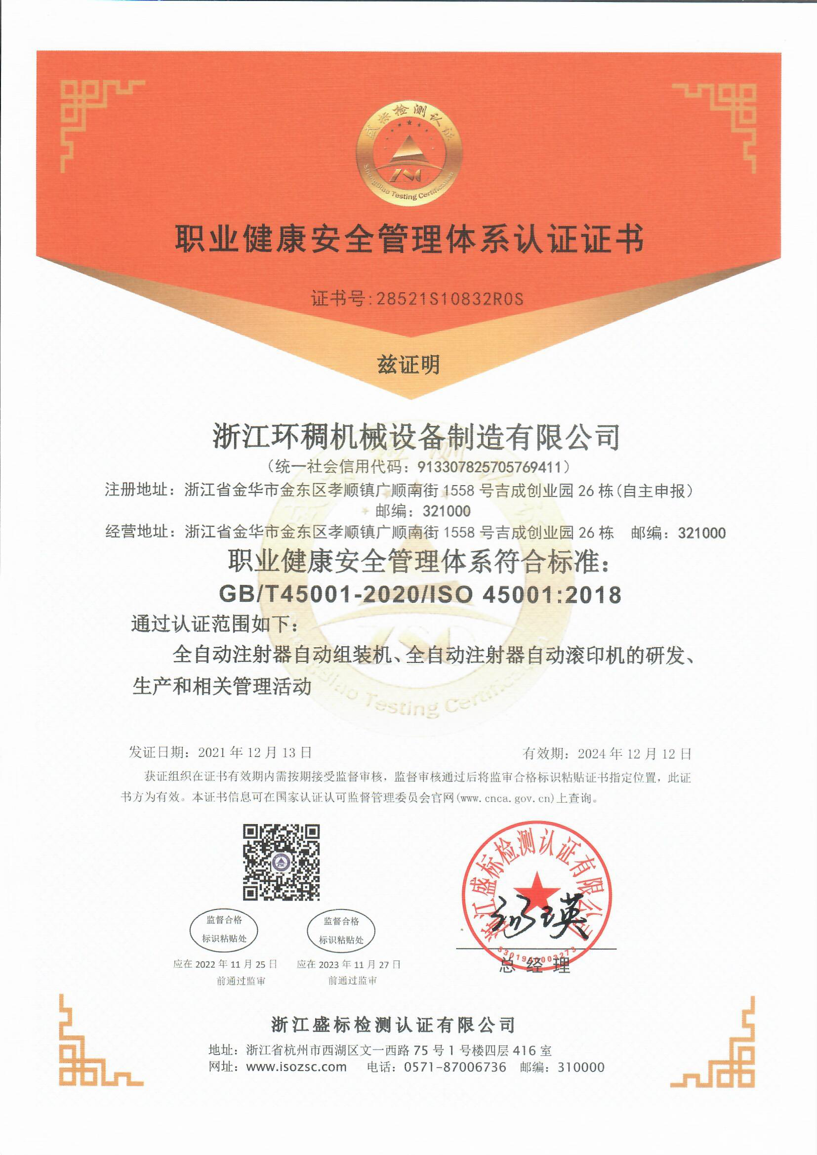 職業健康安全管理體系認證證書
